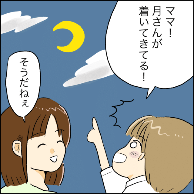 夜、駐車場に向かって歩いている時に月を見つけた息子が「ママ!月さんが着いてきてる!」と驚きながら言いました。