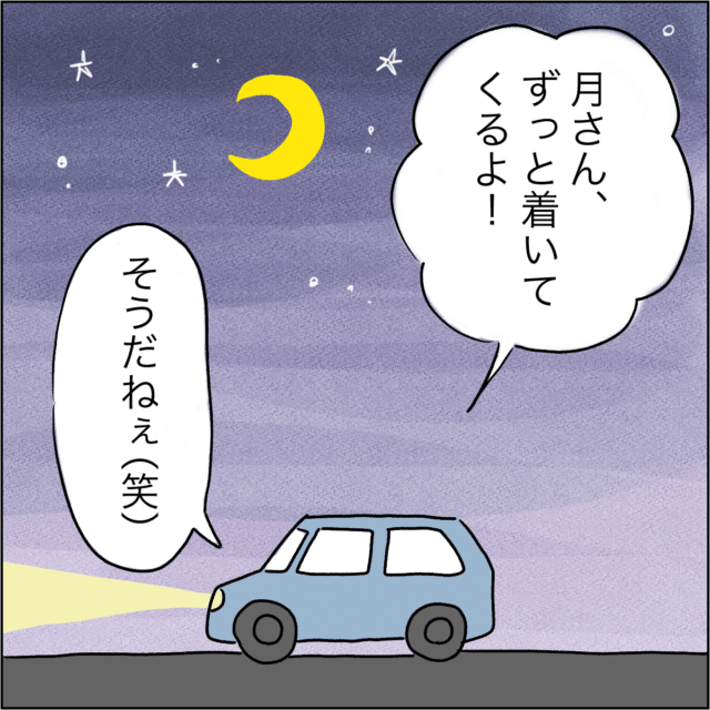 車に乗ってからも「月さん、ずっと着いて来るよ!」と月を気にしていました。