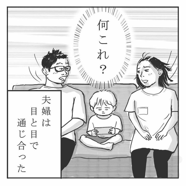 そろそろゲームをやめるように注意された息子ですが、全然止めようとしません。「ぽうっ」という声とともに両親の腕にキスをするという不思議な行動に、ふくこさんと夫さんは謎に包まれます。