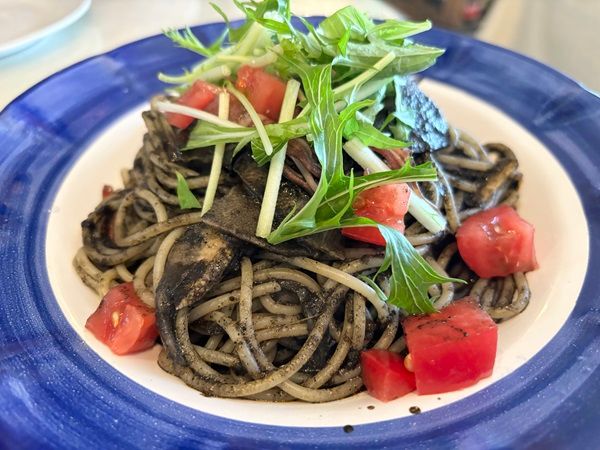 以前土曜日に行ったのですが、パスタセット(好きなパスタ料理に小さな前菜・バゲット、そしてコーヒーか紅茶が付く土日祝日限定のセット、パスタ価格+390円)を食べた時のパスタをご紹介。 こちらは「ビアンカ特製イカスミソース」(1100円)。スパゲティ―かリゾットを選択できスパゲティ―に。そこまで塩気が強すぎず野菜との相性もばっちりで、イカスミの墨色にトマトの赤や水菜の緑が映えます!