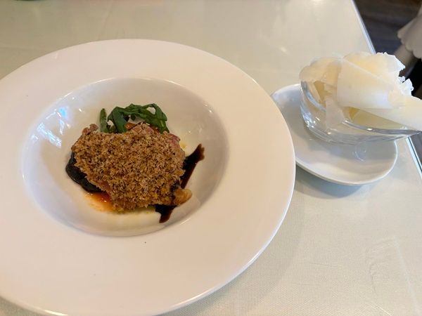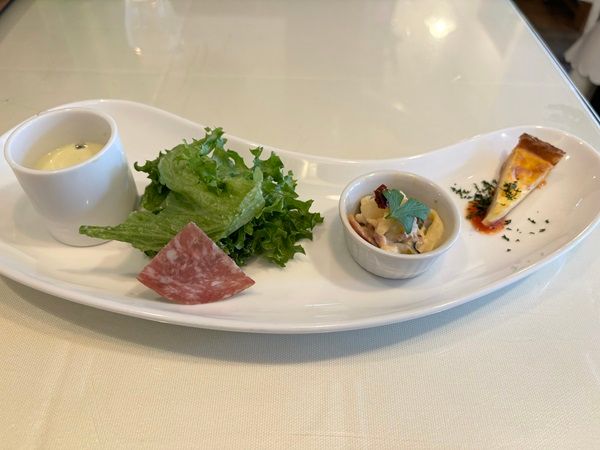 小さな前菜たちが運ばれてきました。一番左のミニカップは「白髪ねぎのスープ」で、ねぎの味わいがしっかりと感じる中にちゅるんとした何かが入っています!この何かがプチっとはじけて、食感のポイントになりおいしかったのでお聞きするとバジルシード(バジルの種)だそう。右から2番目のポテトサラダに入っているブラックオリーブが良い塩梅です。