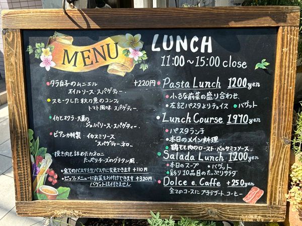 平日のランチタイムには「パスタランチ」(1200円)、パスタランチにメイン料理がプラスされた「ランチコース」(1970円)、彩り10品目のたっぷりサラダの「サラダランチ」(1200円)のほかに、+330円でピッツァメニューに前菜を付けることや+250円で全てのコースにプチデザートとコーヒーも注文できます。