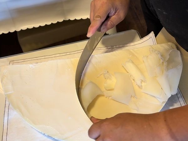 インスタで削っている動画をUPされていたのを見たことがあり、特別に目の前で削っていただきました。 みるみる削られていきあっという間にチーズの山に。かなり薄く長ーく削られているので食べるときにビックリしました。結構量が入っているので全部食べきれるか少し不安になりましたが、あっという間に完食!ワインのお供にも良さげです。