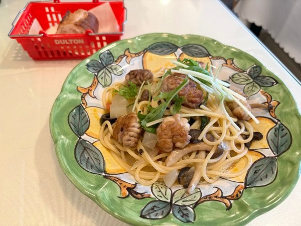 ランチで選べる5種類のパスタから「タラ白子のムニエル オイルソース・スパゲティ―」(+220円)にしました。 とにかくタラ白子がおいしい!自分で調理するとなると、特に焼くのが難しい白子。このタラ白子は焼き加減が絶妙でカリっとして香ばしく濃厚な味わい。野菜もたまねぎ・水菜・大根・オリーブ・トマトとたくさん入っているのですが、中でも珍しいのが空心菜。空心菜のシャキシャキが何とも言えないおいしさです。