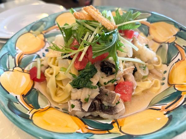 こちらは、「ハモのスモークアンチョビソース」(1320円)。リングイネかフェトチーネを選択できフェトチーネに。 こちらをいただいた時期がハモの季節だったのでより甘さと香りがふわーっと豊かに押し寄せきます!そしてたっぷりの野菜もおいしくいただきました。