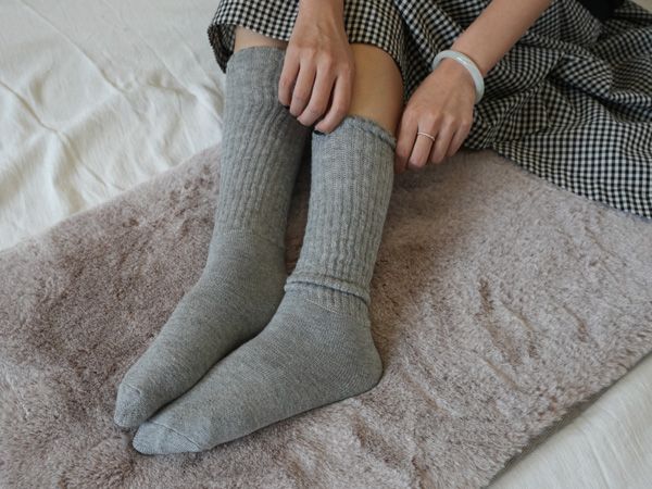 はくだけで足首やふくらはぎをしっかりと温めてくれるソックスは、空気を包み込むようにふんわりと編み込まれているため、やわらかなはき心地でありながらムレにくい快適さを実現。高い伸縮性を持つ素材を使用しているので型崩れしにくいのもうれしいポイント。