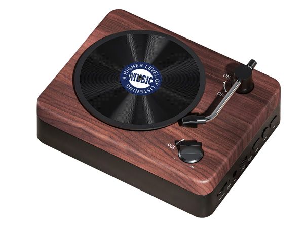 レトロなターンテーブル風デザインのスピーカー。再生中はクラシックレコード盤がくるくる回るのがかわいい。Bluetoothでのワイヤレス接続とAUX端子での有線接続、どちらも可能です。
