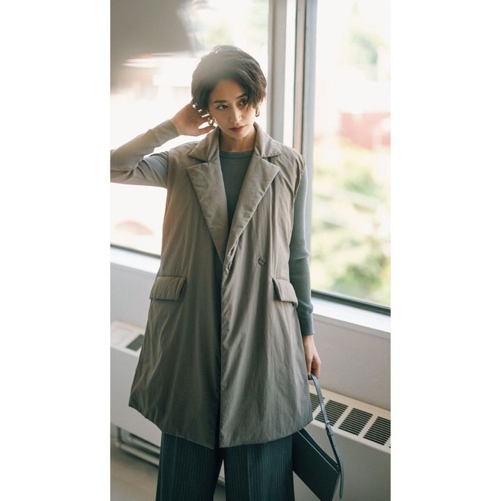 きれいめアイテムのジレは カジュアル素材で取り入れるのが旬。 大人ベージュがグレーコーデにマッチ