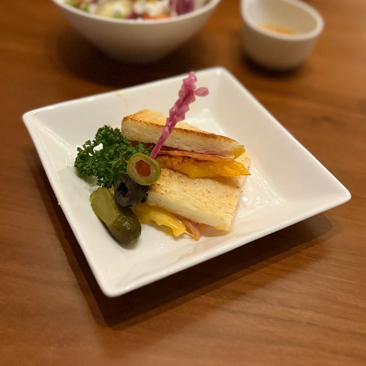まずはさつまいもとかぼちゃを使った秋らしいサラダと、ハムとチーズを使ったホットサンド。