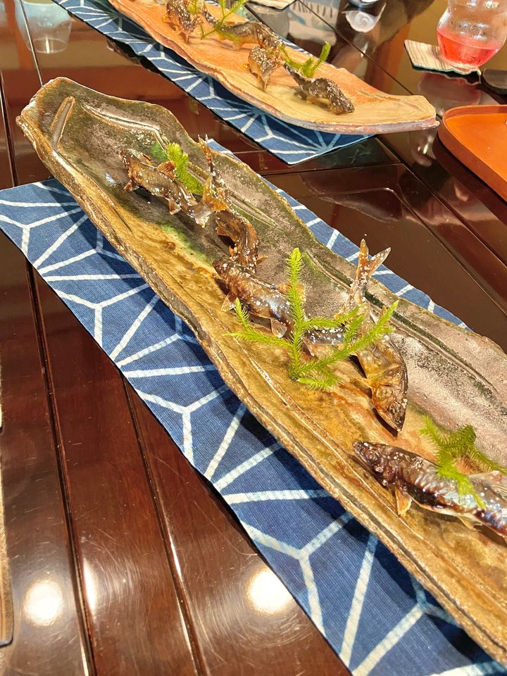 熟鮓や猪、岩魚押し寿司、花山椒、根曲竹、蓮根、手長海老など。