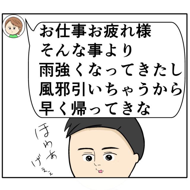 「お仕事お疲れ様。そんな事より雨強くなってきたし風邪引いちゃうから早く帰ってきな」と良し男さんを気遣うメッセージ。それを見て良し男さんは心が温かくなりました。