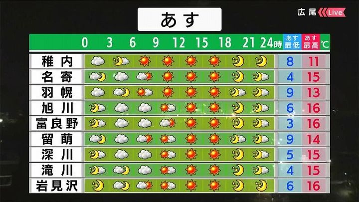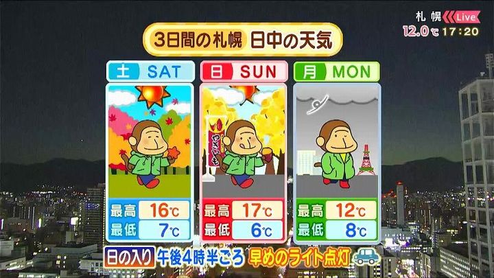 日曜は多少日ざしが出る程度です。日曜の夜から月曜の朝は広く雨の降る時間があるでしょう。月曜は北風が冷たく、札幌の最高気温は12度です。
