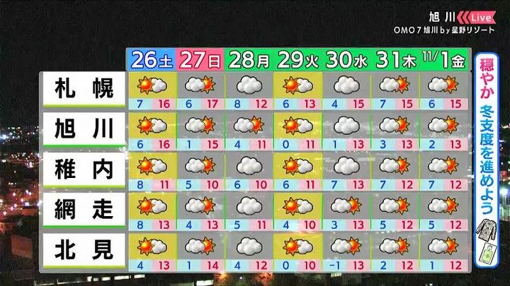 背景は25日午後5時20分ごろの旭川情報カメラ。旭川では25日、カエデの紅葉が観測されました。神楽岡公園にある標本木を気象台の人が見ているんですが、その木の大部分が紅葉していたら発表されるんです。平年より2日遅い観測でした。