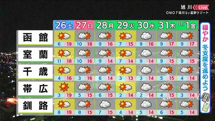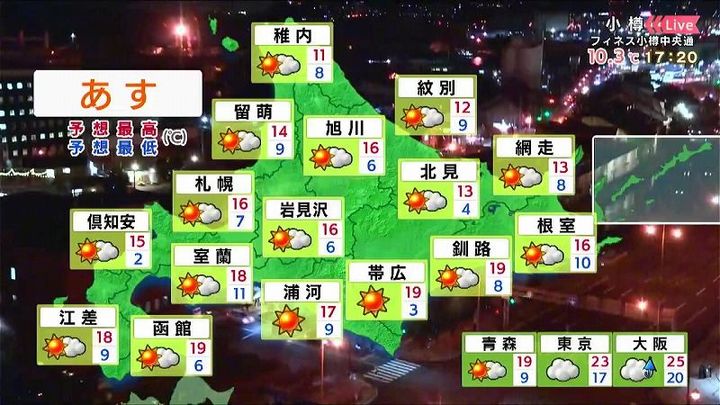 背景は25日午後5時20分ごろの小樽情報カメラ。土日も割合気温は高めで経過するので、秋物のコートで外出できそうですよ。