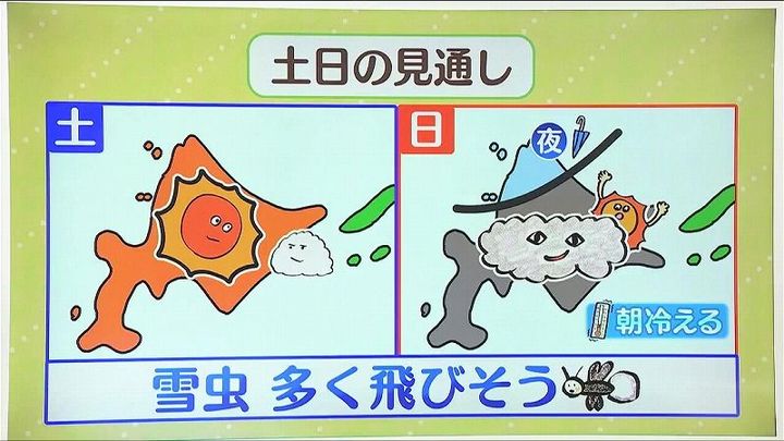 穏やかですが、日曜の朝は内陸で0度前後と寒くなります。また、日中は雪虫が多く飛びそうですよ。