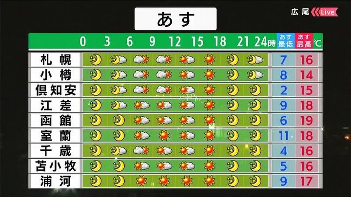 晴れますが、札幌など昼頃まで多少くもる時間があります。最高気温は函館や室蘭など道南方面で20度近くまで上がって、日差しが暖かいでしょう。