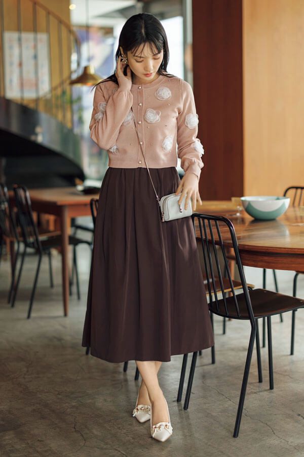 カーディガン¥11,990/WILLSELECTION(WILLSELECTION ルミネ有楽町店) スカート(一部店舗のみ発売)¥2,990/GU イヤリング¥14,300/IRIS47 バッグ¥19,800/トフ&ロードストーン(ティーアンドエル) シューズ¥2,399/GRL