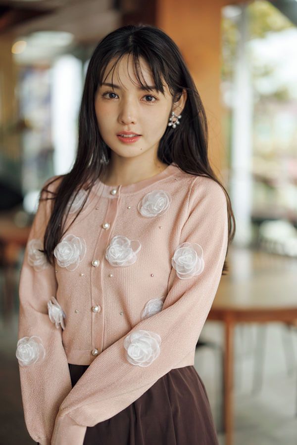フラワーモチーフを筆頭に、ビジューやパールボタンをあしらったロマンティックなカーデ。前を開けてさらっと羽織っても◎。ボトムはベーシックかつプチプラ系でメリハリをつけて、賢くおしゃれを楽しんで♪