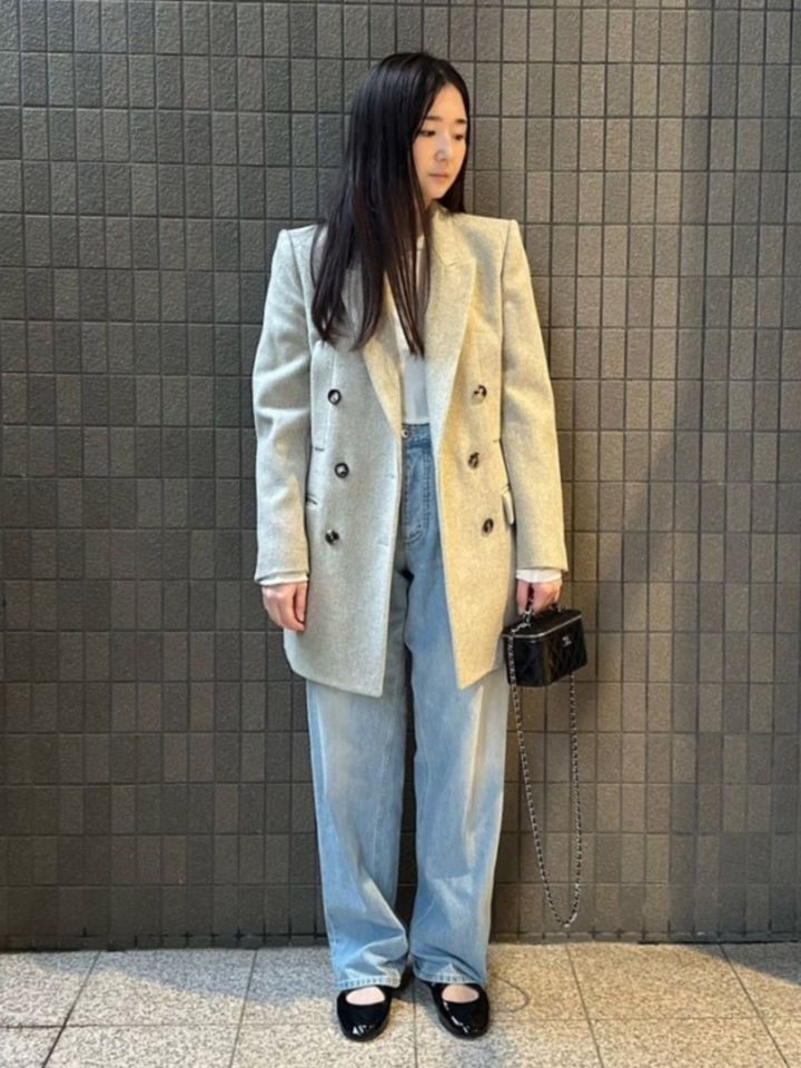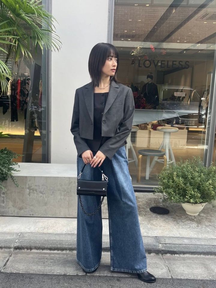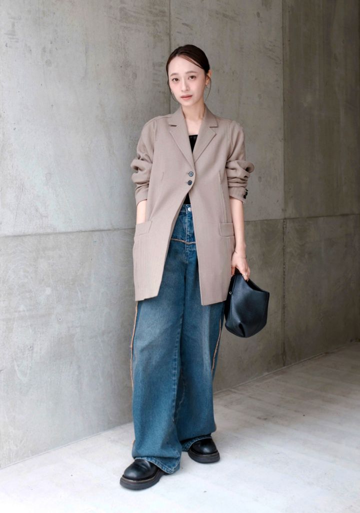 「キレイなシルエットで気に入っているジャケットを、カジュアルに着たかったので太めのデニムパンツを合わせました。バッグと靴は黒にすることで、キレイめな要素をプラスしてスタイリングを引きしめました」