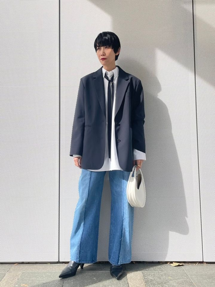 「ハンサムなスタイルにポインテッドトウのシューズで女っぽさをプラスしたスタイリング。ボクシーなシルエットのジャケットには内側と外側で生地を切り替えたデザインデニムを合わせて、ほどよくモードも感じるスタイルに。緩く結んだタイもこなれて見せるポイントです」