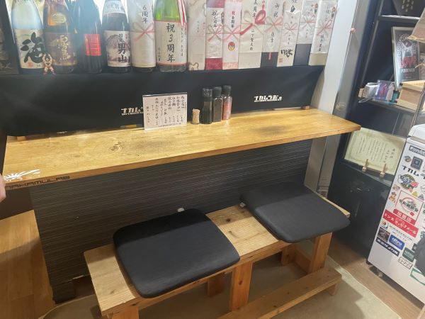 扉を開ける瞬間がドキドキ度Maxです。 パッと目に飛び込んで来たのがこのカウンター席。卓上のお品書き、塩コショウなどを見て、やっとここが「御忍び麺処ナカムラボ。」と実感できます。奥にキッチンがあり、このスペースは、俗に言う ”リビングダイニング” ですね。