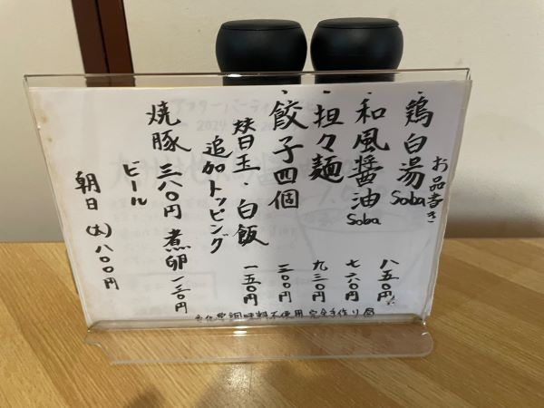 卓上に置かれたお品書き。 よく話に聞くのが鶏白湯Sobaです。今回は、和風醤油Sobaを楽しみに訪問しています。 キッチンから聞こえてくる音を聞いて待っていると、さらにワクワクしてきます!