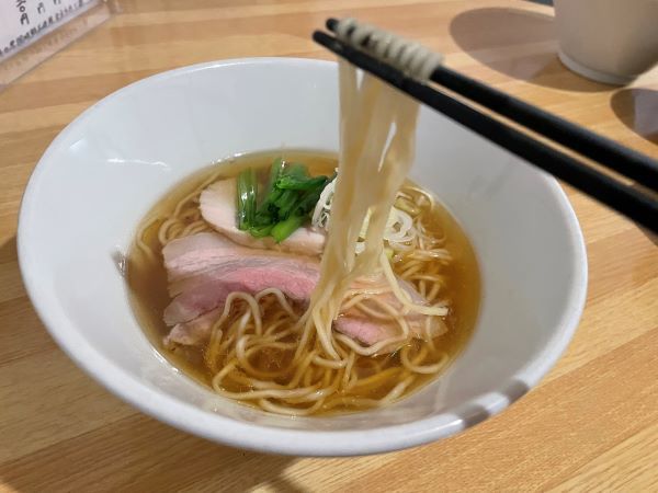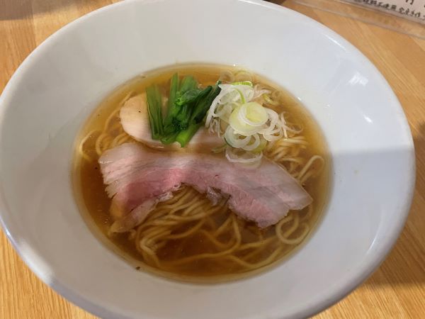 お目当ての和風醤油Sobaの登場。 透き通ったスープは見るからに美しい。薄口醤油のスープにストレート細麺、大ぶりなチャーシュー2枚、ほうれん草、ネギがバランスよく盛られ、水彩画のように見えます。