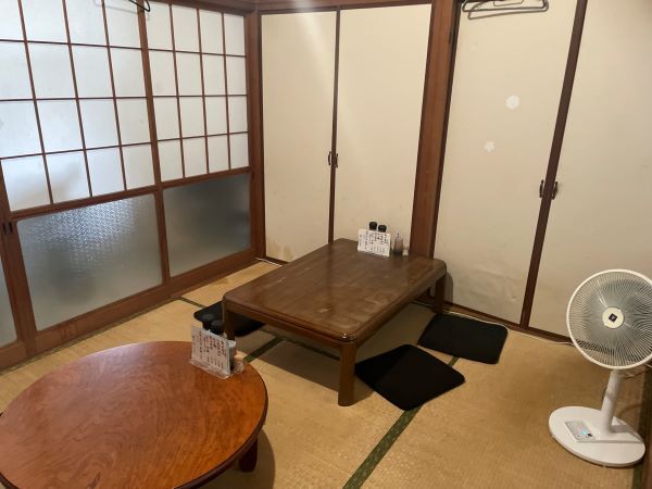 カウンター席の左側には6畳の客室があります。タンスなどの一般家庭にある家具が無いのでとても広く感じます。 4人席が1卓、2人席が2卓あります。今回は、和室の2人席を確保。この空間、なんだか親戚一同集まった田舎の広間を思い出します。