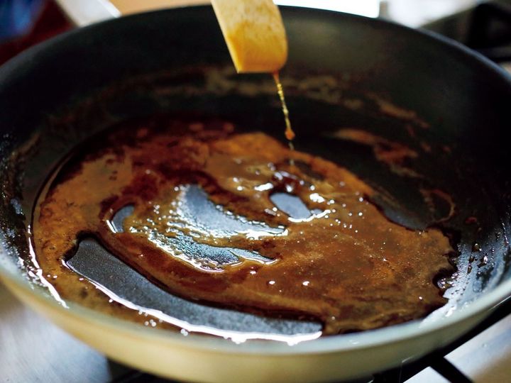 深めのフライパンにみつの材料を入れて中火にかけ、焦げつかないよう絶えずへらで混ぜる。茶色く色づき、へらですくうとぽたりと落ちるくらいになるまでとろみがついたら、さつまいもを加える。