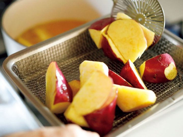 油を高温※に熱してさつまいもを戻し入れ、ときどき全体を混ぜるようにしながら、揚げ色がつくまで3~4分揚げる。取り出して油をきる。