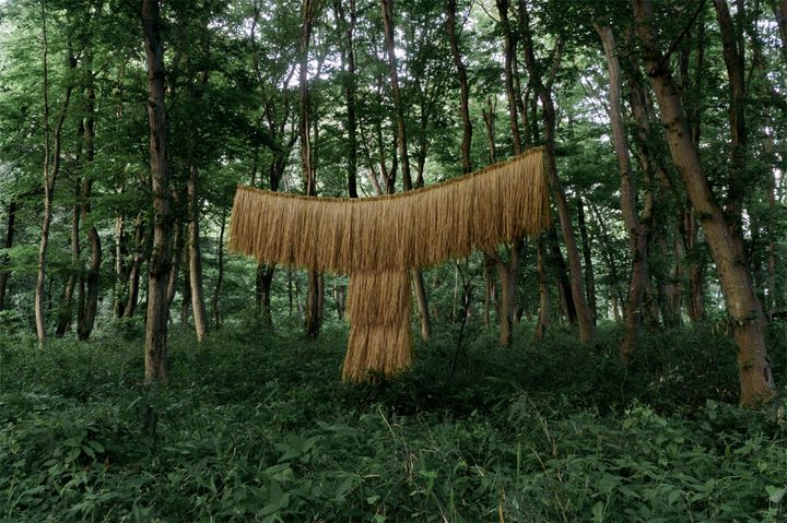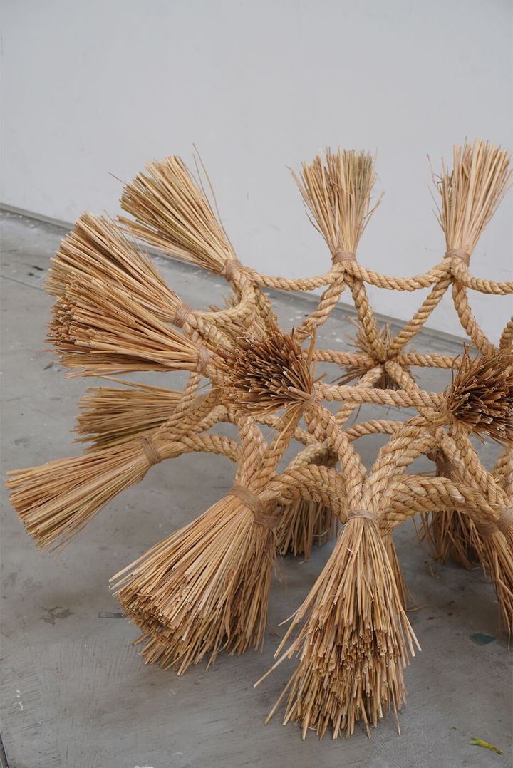 古来から屋根や壁だけでなく神事にも使われてきた稲藁を大胆に用いた作品は、圧倒的な存在感を放ち、会場に厳かな雰囲気を漂わせる。編み方の違いで様々な表情を見せ、日本人の暮らしを支えてきた稲藁。