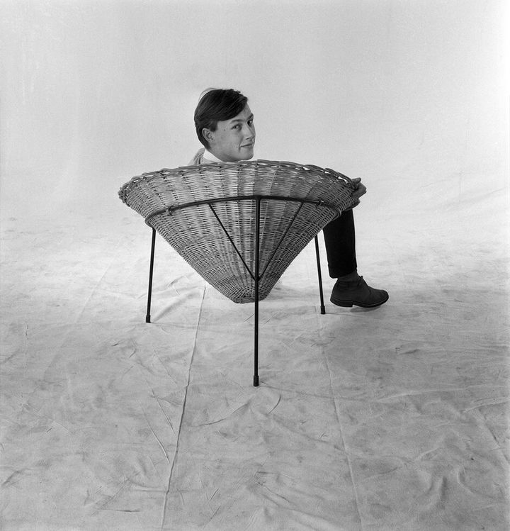 コンランと彼がデザインした「コーン・チェア」、1952年撮影 、レイモンド・ウィリアムズ・エステート蔵Photo © Estate of Raymond Williams / Courtesy of the Conran family