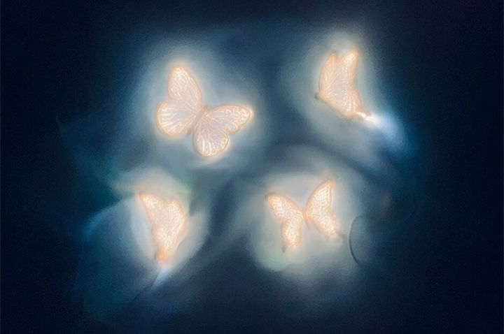 作品の蝶は触れると連鎖的に発光する技術で作られており、まるで実際に羽ばたいているよう。幻想的な光と共に会場を美しく彩る。