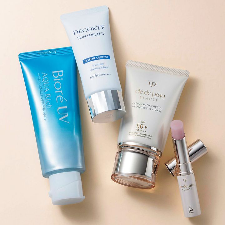 左から、ビオレ UV アクアリッチ ウォータリーエッセンス SPF50+/PA++++ 50g オープン価格(花王)コスメデコルテ サンシェルター マルチ プロテクション コンフォート SPF50+/PA++++ 35g ¥3,300(コスメデコルテ)クレ・ド・ポー ボーテ クレーム UV n 50g¥11,000 クレ・ド・ポー ボーテ ソワンプロテクトゥールレーブル SPF30/PA++++ ¥6,600(ともにクレ・ド・ポー ボーテ)