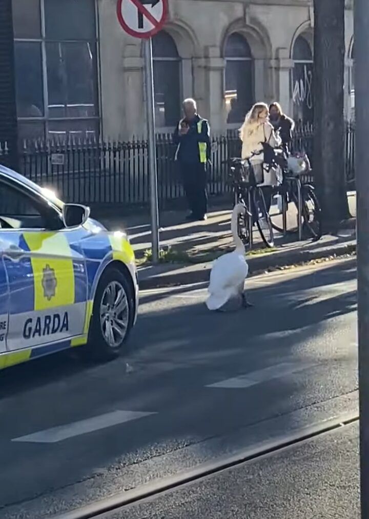 なんと、その車両の前には、1羽の白鳥の姿が! どうやら、警察官たちはこの白鳥のことを安全な場所まで誘導しようとしているみたいです。