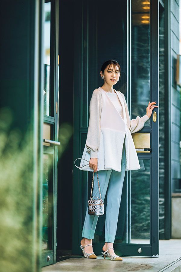 ジレ¥16,830/MERCURYDUO(MERCURYDUO ルミネエスト新宿店) ニット¥8,492/NATURAL BEAUTY BASIC パンツ¥19,800/マイストラーダ バッグ¥7,920/RANDA イヤリング¥9,450/アビステ ミュール¥19,800/銀座かねまつ(銀座かねまつ6丁目本店)