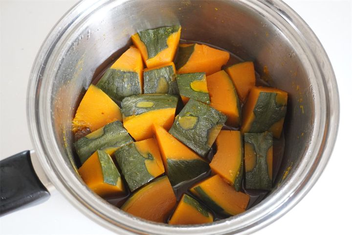2.鍋に1のかぼちゃと[A]を入れて沸騰させたら、フタをして約10分煮る。