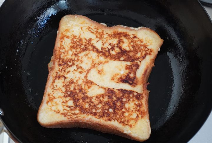 卵液が染みた食パンはやわらかいので、丁寧にフライパンに入れます。