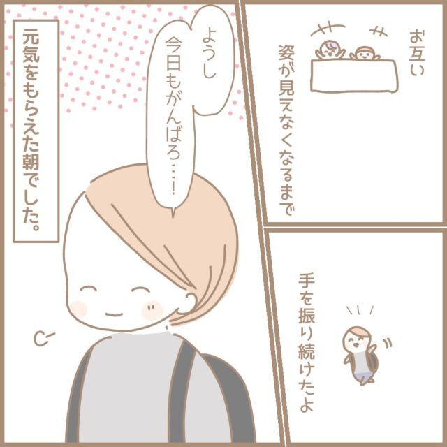 うれしいですよね!私も最近たまに子どもに見送ってもらう日が出てきて元気をもらっています!