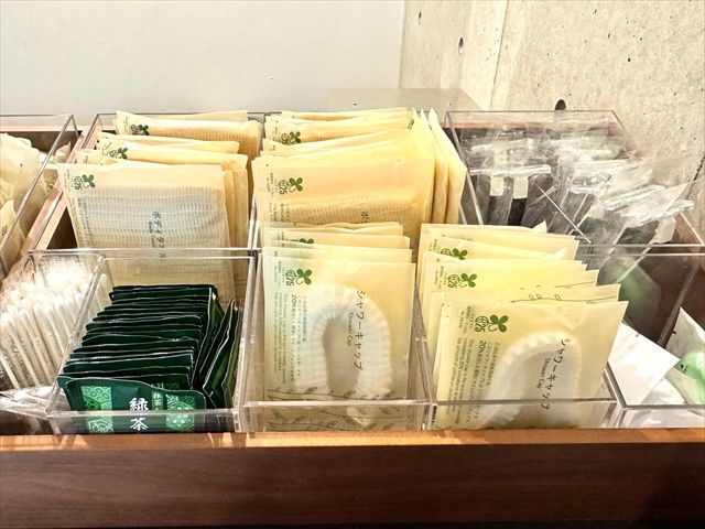 シャンプー・コンディショナー・ボディソープ・洗顔・ハンドソープもお部屋にあり。クレンジングはないので、持参しましょう。フロントでPOLA アロマエッセゴールド フェイスケア4点セット(メイク落とし・洗顔料・化粧水・乳液)が500円で購入できます。