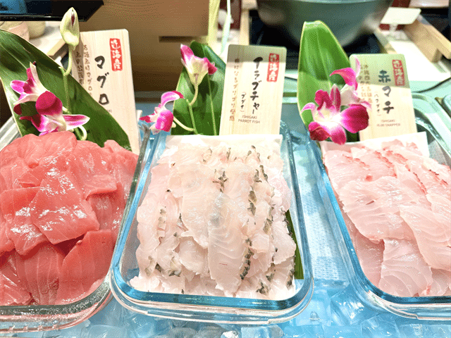 まず目に飛び込んでくるのは、ズラリと並んだお魚たち。新鮮さが伝わってくるプリッとしたお刺身が並んでいます。