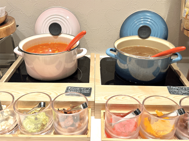 スープも日替わりで登場。この日は、具沢山のトマトスープとじっくり炒めたオニオンスープでした