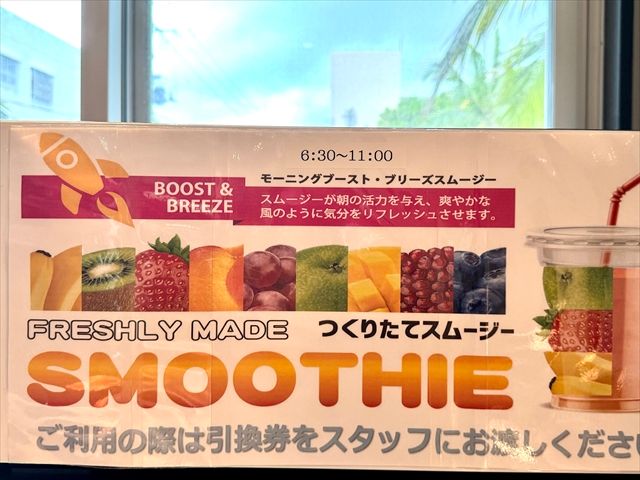 また、朝食なしの素泊まりプランにはスムージーがついています。味は4種類あり、1番人気はブルーベリー・リンゴ・バナナが入ったスムージー。朝食付きプラン利用でも、プラス500円でスムージー引換券を購入すれば楽しめます。