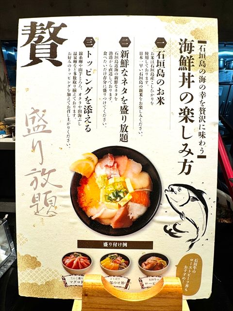 海鮮丼は石垣島産のコシヒカリに、好きなお魚を盛り、錦糸卵や山芋とろろ、オクラ、山海ぶし、温泉卵など、好みのトッピングと一緒に楽しめます。