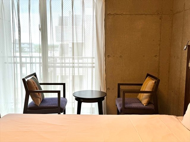 窓際にテーブルとチェア、別でPC作業もできるデスクもあり、十分な広さ(23平方メートル)です。ベッドボードやデスクにもコンセントがあって便利。フリーWifiも利用できます。