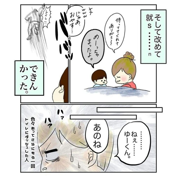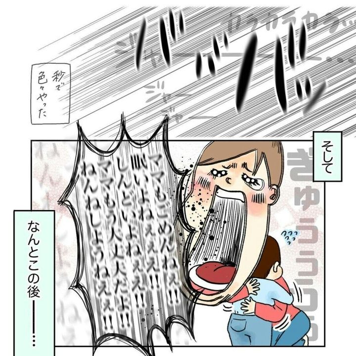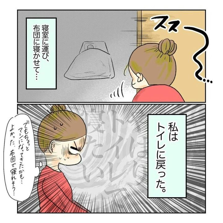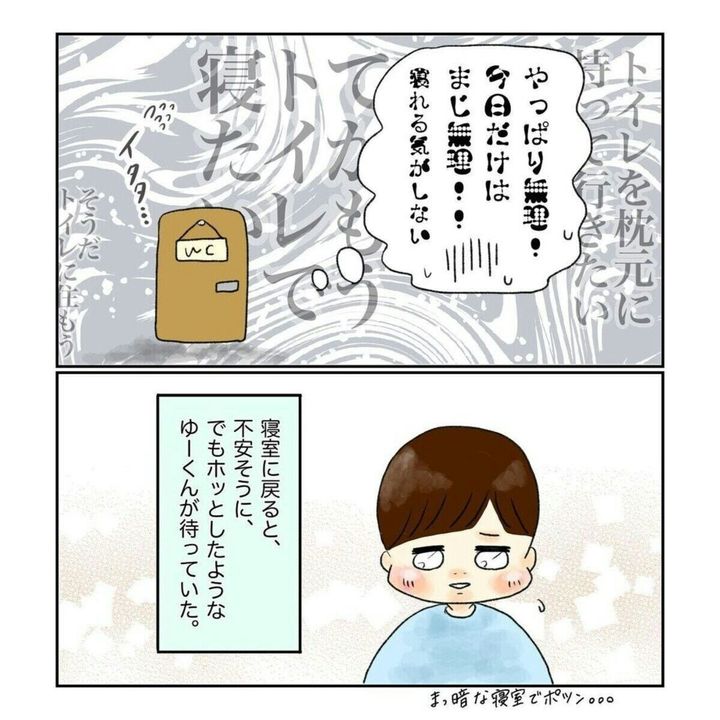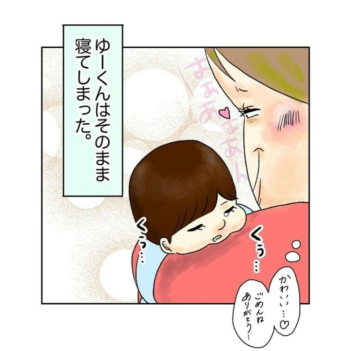 ついに耐えきれず大きな声を出してしまったゆいさんでしたが、思わず息子を抱きしめて「ごめんね」と話します。ゆいさんの腕の中で安心したのか、そのまま寝てしまった息子。トイレから布団へ連れて行き、無事に寝かしつけは完了したのでした。