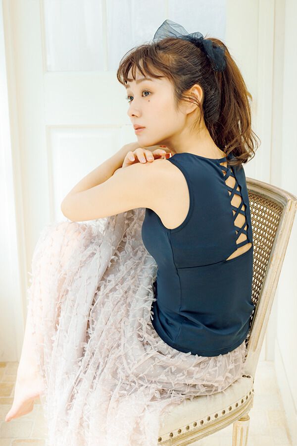 露出度が高すぎない背中あきトップスなら、ちょっとした外出にもOK。繊細なチュールスカートを合わせて、ピタゆるのシルエットでレディ感UP。