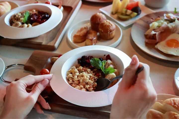 朝食は、厳選した食材を使ったこだわりのメインディッシュとハーフビュッフェ付きのスタイル。バリエーション豊かな朝食は、連泊をするゲストを飽きさせないように楽しみになる朝食となるよう工夫をしているそう。