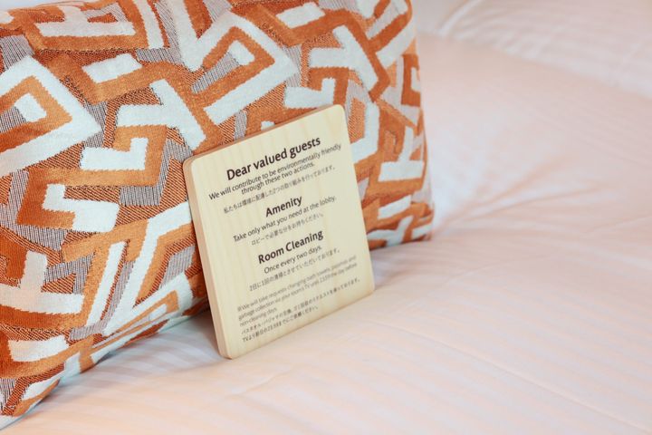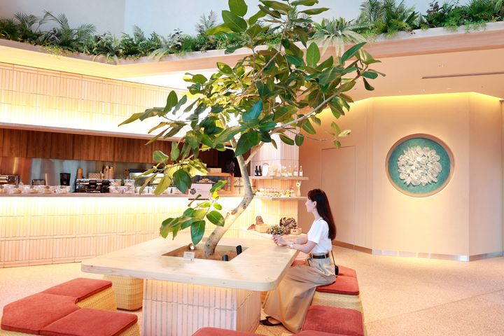 木と緑溢れるエントランスは、開放感がある吹き抜けになっていてナチュラルな優しい空気感がお出迎えをしてくれます。目に留まったのは、チェックアウト後にも荷物を預けることできる広い「セルフクローク」。そして、同ホテルが保有する林の間伐材を活用した家具やアップサイクルのオブジェ、自然素材にこだわった備品など環境にも配慮をした上質な癒しの空間がとても心地よいのが印象的。