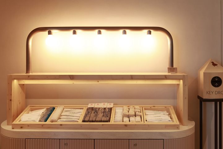 築地本願寺や築地場外市場、歌舞伎座へは歩いて約5分ほど、銀座の中心部も徒歩圏内という好立地。ホテル内は、インバウンド向けの中長期滞在用のゲストに快適に過ごせるような工夫がロビーから盛りだくさん。
